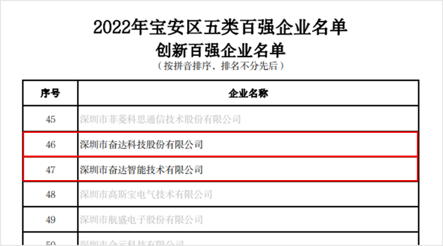 1月6日,深圳市宝安区工业和信息化局发布关于印发《2022年宝安区五类百强企业名单》的通知(下称:通知),通知公布了宝安区工业、增加值、服务业、外贸、创新等五类百强企业榜单。好博体育科技已连续多年登上该榜单,今年再度荣登工业百强、增加值百强、外贸百强以及创新百强(不包括好博体育科技业务未涉及的服务业百强)等四项榜单。值得一提的是,好博体育科技旗下子公司——深圳市好博体育智能技术有限公司今年也登上了创新百强榜单。可见,公司的整体实力经过综合评估,获得了相关部门的认可。