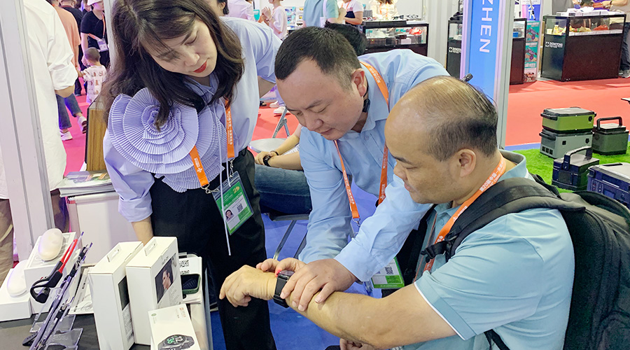 好博体育科技全自研算法检测血压的智能手表Gamma Watch 在展会期间也大放异彩,不少东南亚国家商会的代表都对Gamma Watch内置的气泵血压检测技术表示出相当大的兴趣,现场体验后对于其测量的准确度、佩戴的舒适度表示认可。
